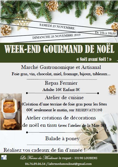 Les 23 et 24 novembre 2019 rejoignez nous lors de notre weekend gourmand de noël à la ferme du Moulinat. Au programme, marché gastronomique et artisanal, atelier cuisine, repas fermier, atelier créations de décorations de noël, balade à poney…