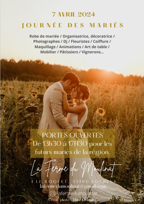 C’est une journée pour vous à la ferme du Moulinat, futurs mariés de la région, sous le signe de la convivialité, de l’amour et du partage. Mais quel partage ? Nous avons la joie de vous recevoir dans notre ferme entièrement mise en scène et accueillant des prestataires de la Gironde, des petites entreprises locales qui sont […]